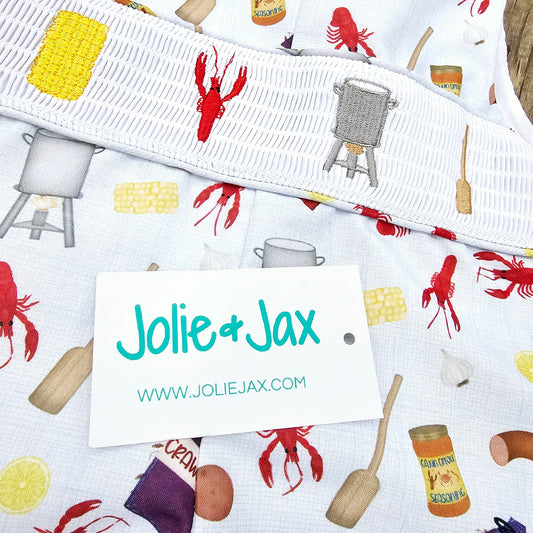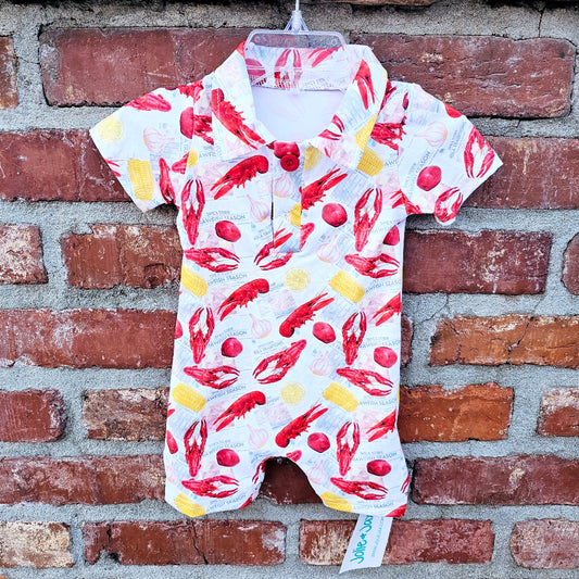 • Crawfish, boil, newspaper, seafood, corn, romper, boys, baby clothing, boutique, New Orleans, Louisiana romper