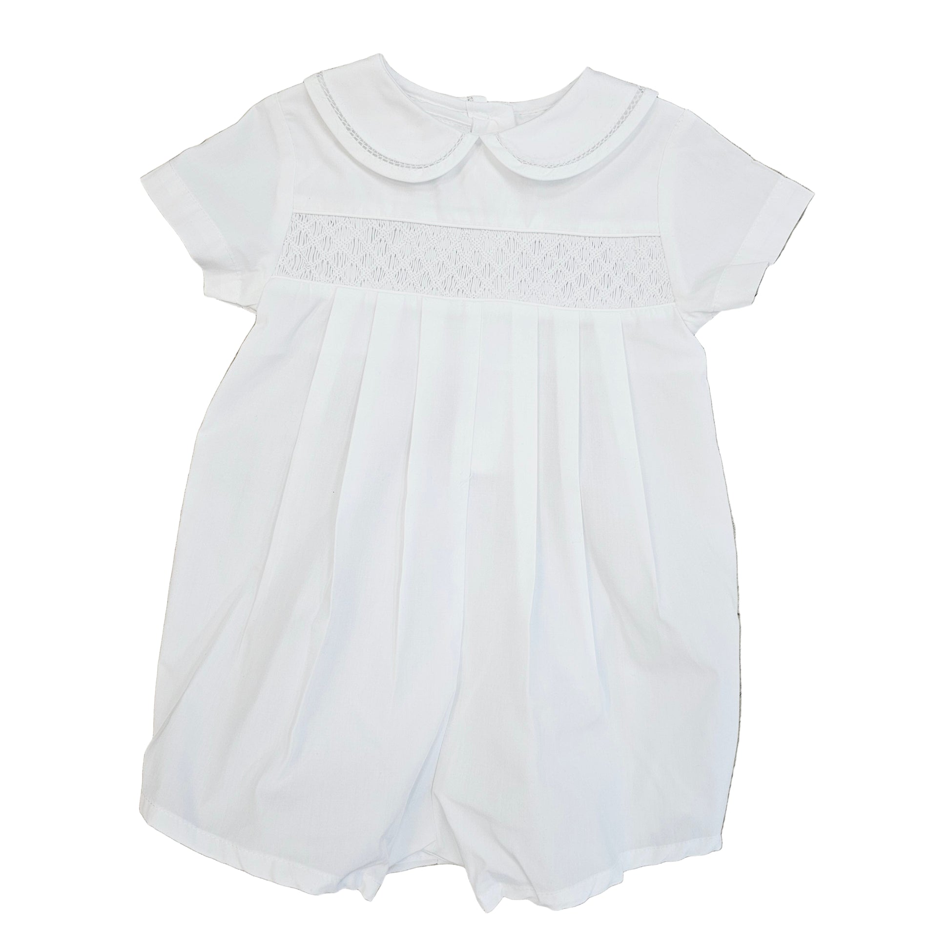 Welcome your precious boy into the world with this heirloom-quality christening romper! Hand-smocked cotton details create an enchanting, timeless look that's perfect for dedications, christenings, and those unforgettable milestone moments. Soft and gentle against delicate skin, this romper is designed to become a treasured keepsake—one you'll love passing down through generations. Watch your little gentleman steal hearts in this classic, playful style!