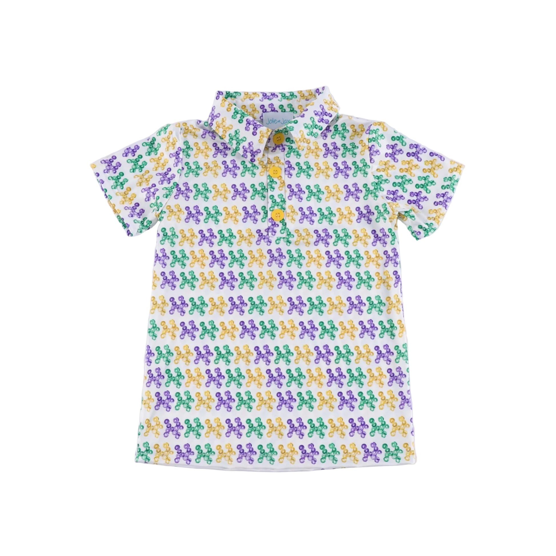 Bring the festive spirit of Mardi Gras to your little one's wardrobe with this charming Bead Dog polo! Featuring a playful printed design in classic purple, green, and yellow, this kid's polo captures all the joy and excitement of the celebration. Perfect for parades, parties, or everyday fun, it's a vibrant way to add personality to any outfit. Comfortable and colorful, this polo keeps kids looking sharp while staying true to the season's festive energy.