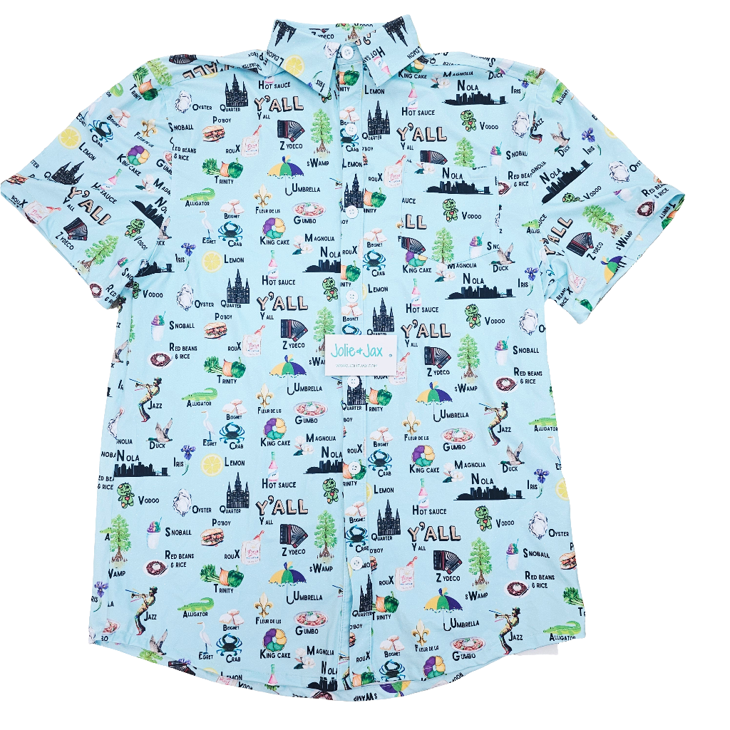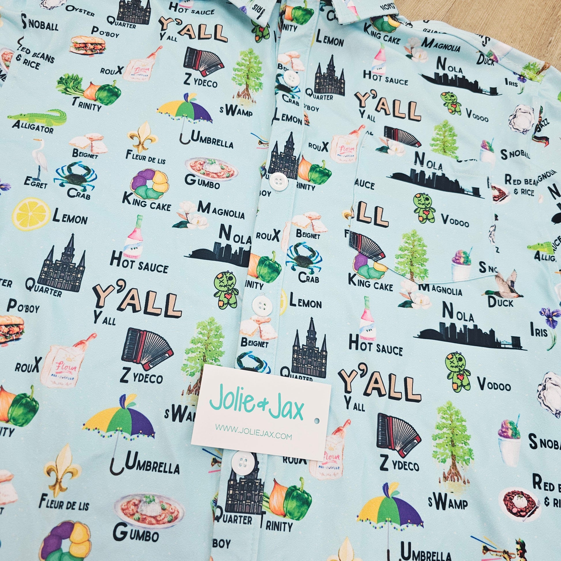 Get ready to spice up your wardrobe with our Cajun ABC’s Men’s Button Up Shirt. Perfect for family outings and gatherings, this shirt will have you and your loved ones matching in style.
