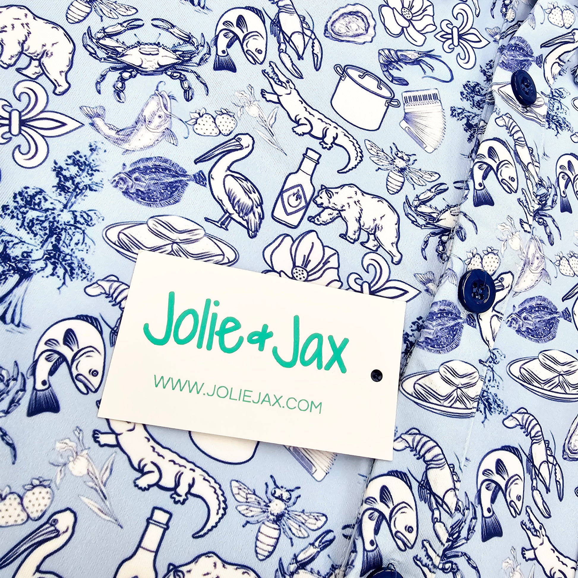 Add some "flavor" to your wardrobe with our Cajun Toile Men's Button Down Shirt! Featuring a playful print of blue alligators, fish, shrimp, and other Louisiana symbols, this shirt is sure to spice up any outfit.