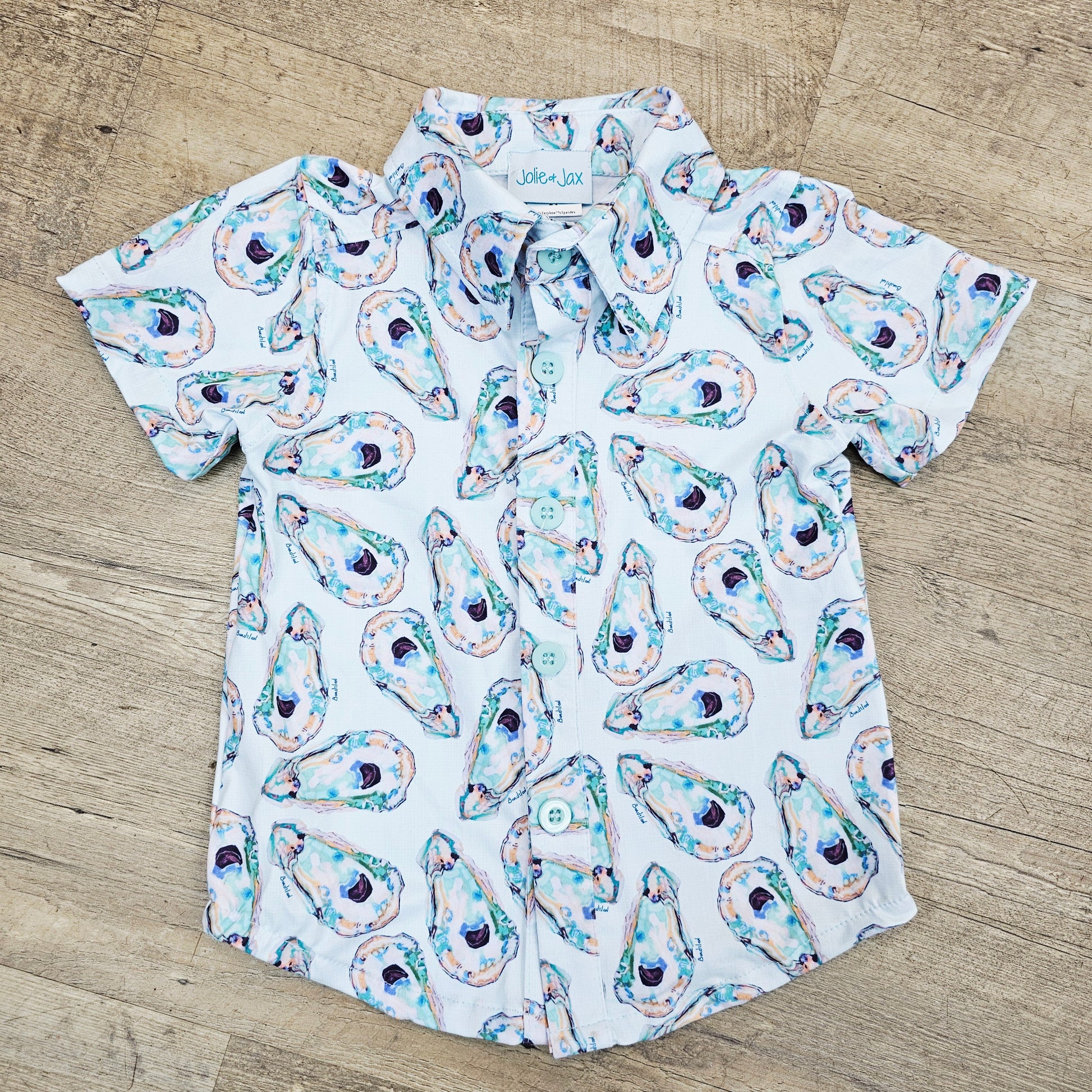 This playful Jackson Oyster Button Down Shirt for kids features a charming oyster design inspired by New Orleans artist Anthony Bordelon. Perfect for little adventurers, it combines fun style with comfortable wear, making every day feel like a seaside escapade.